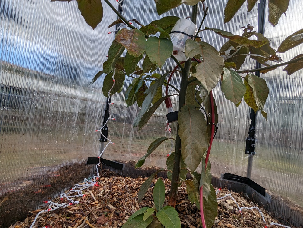 Not looking so great despite the protection of a polycarbonate cube and a string of lights. But still a lot better than most of the rest of the trees!