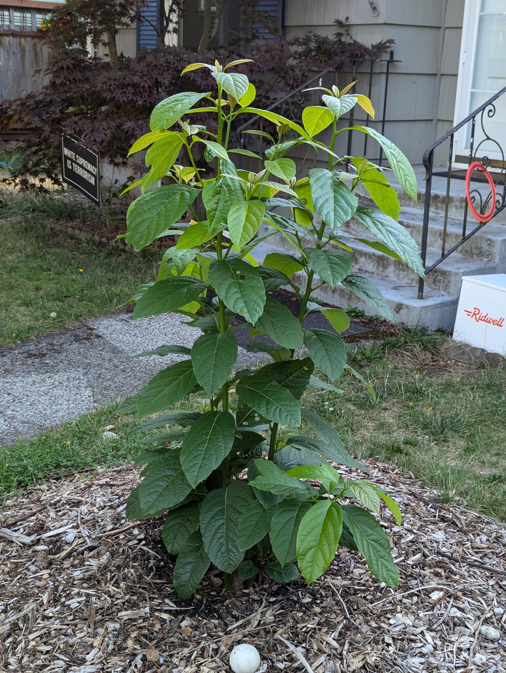 Has grown continuously since spring and is already almost 5 ft tall again, this time with multiple trunks.
