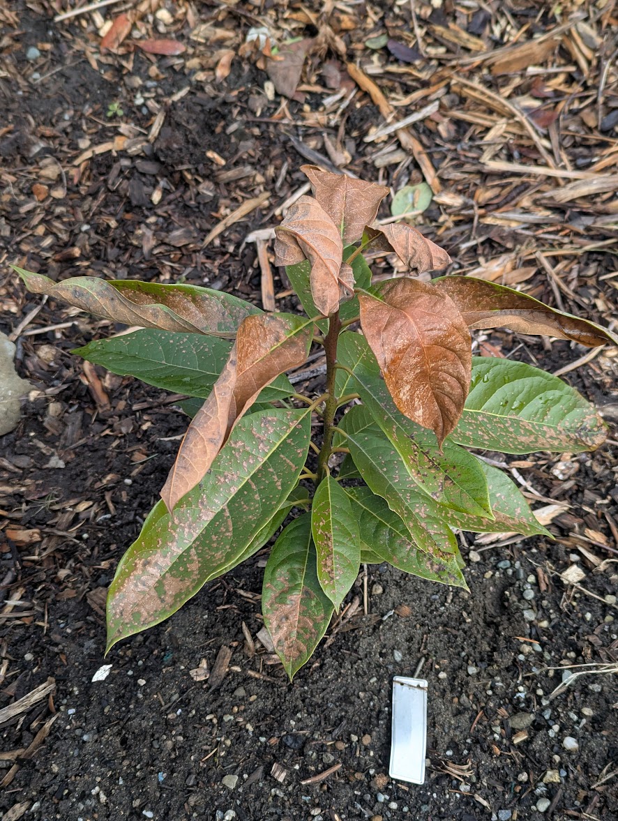 After a few weeks of intermittent mild to moderate freezes (lowest temperature of 25.7°F/-3.5°C), this tree shows some damage but seems mostly happy.