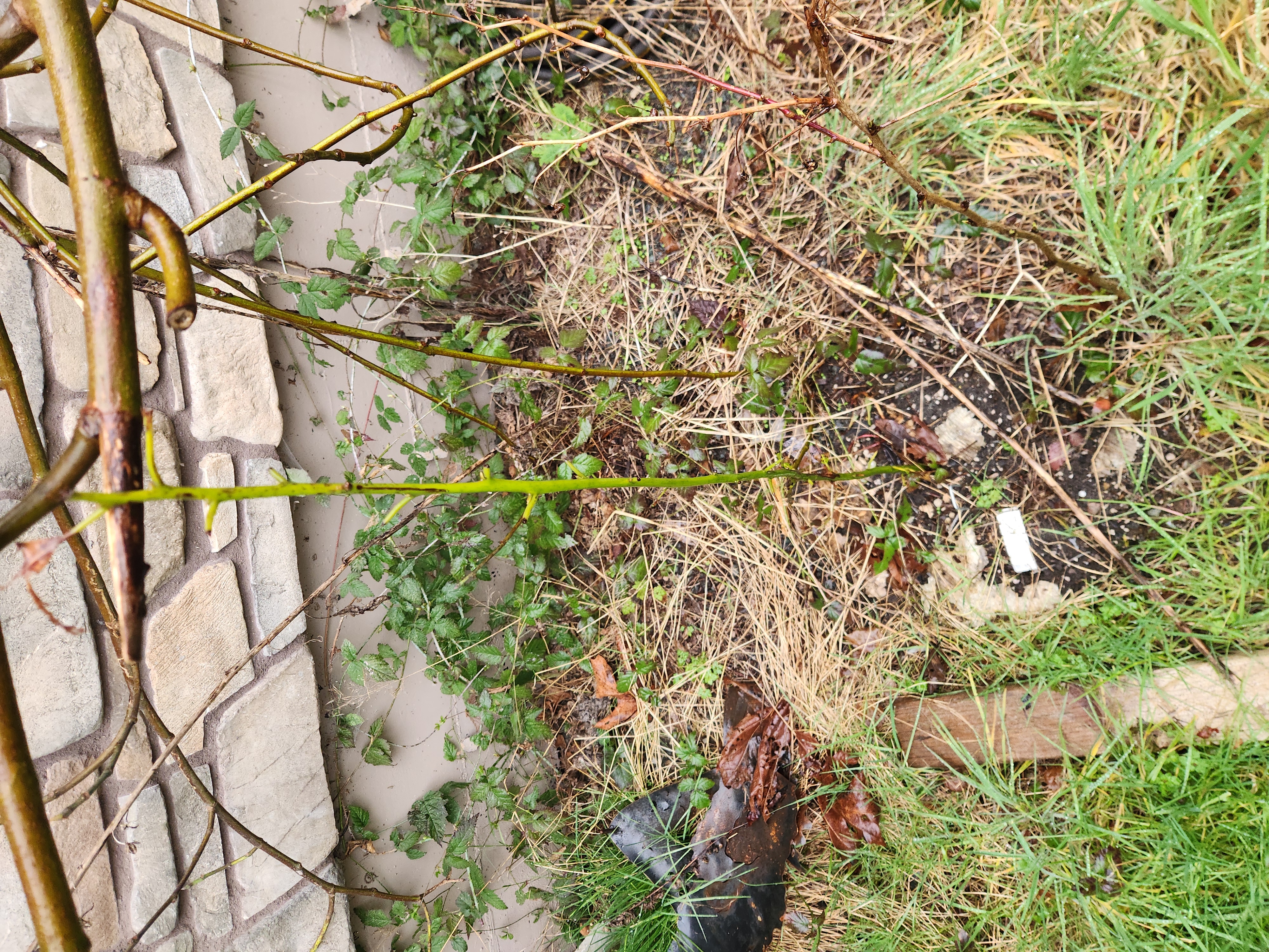 Aargh! Looks like a deer must have snipped off all the leaves, but the trunk looks viable despite only a thin layer of leaves at the base as winter protection, though it is planted next to a south-facing brick wall. It's about 3 feet high.