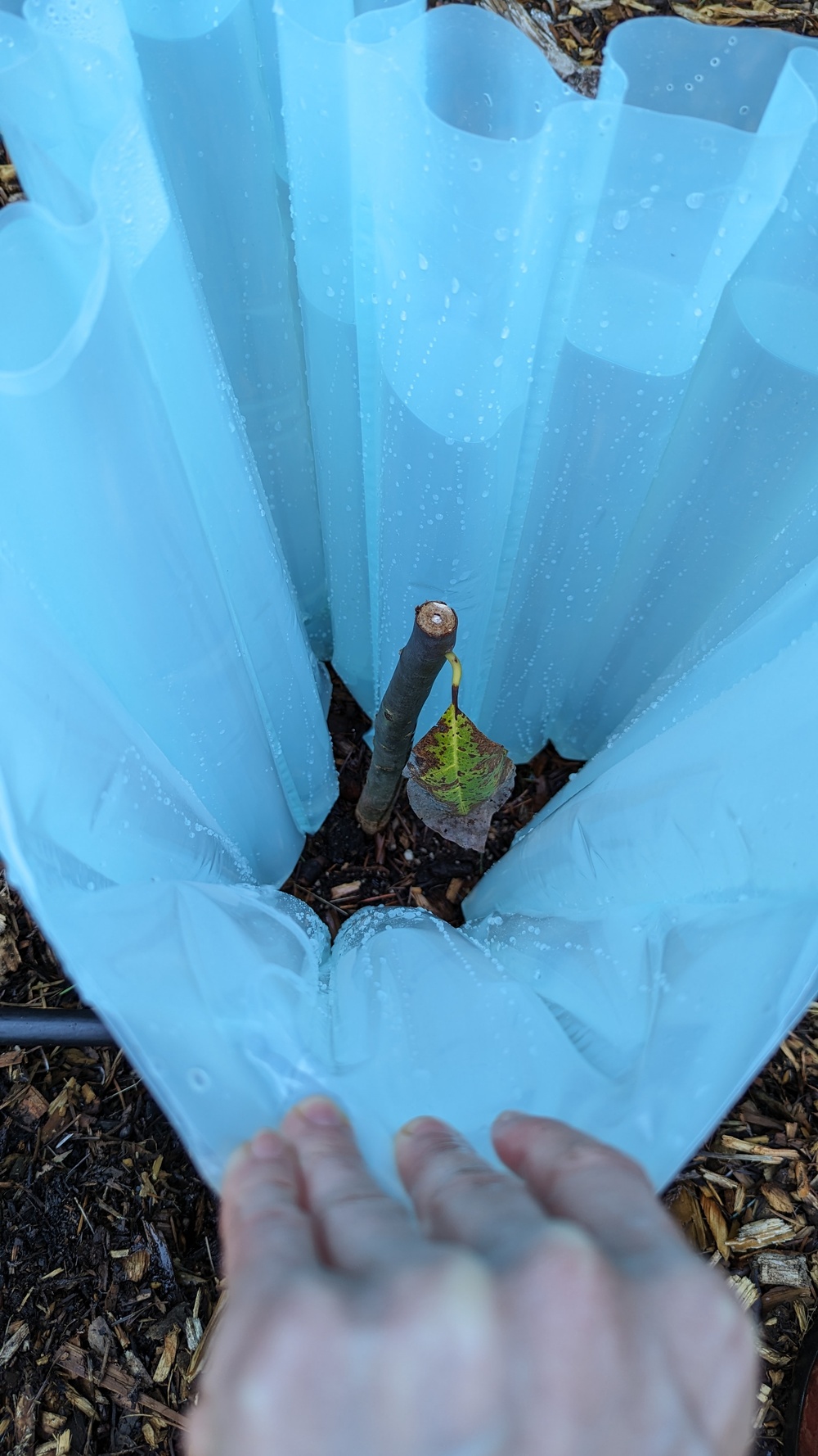 Surrounded tree with a "wall 'o water" and covered with row cover before the hard frost came through. We got down to at least 24* here. It's not looking great