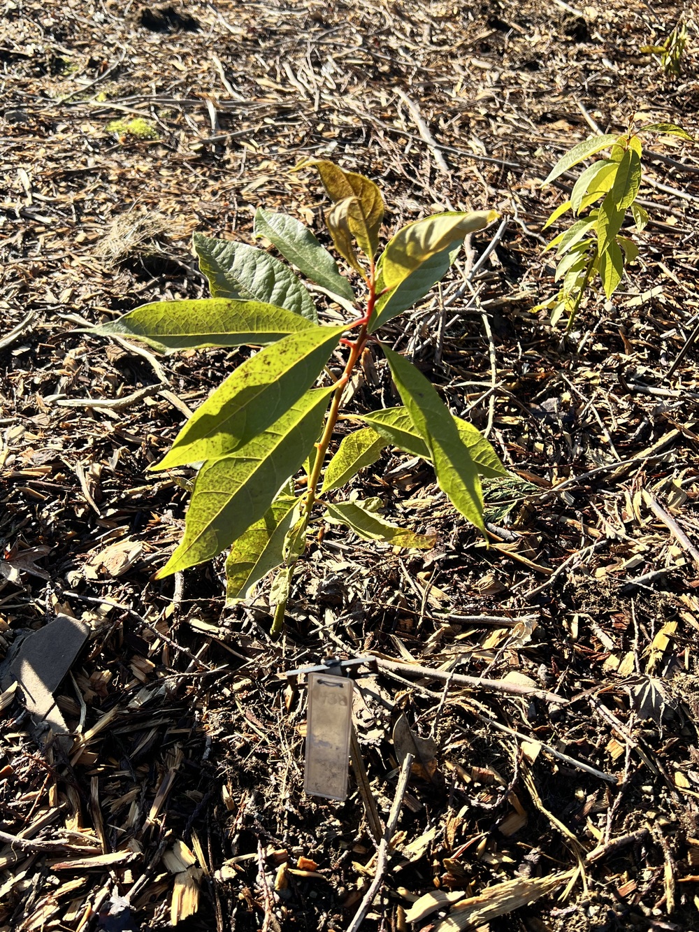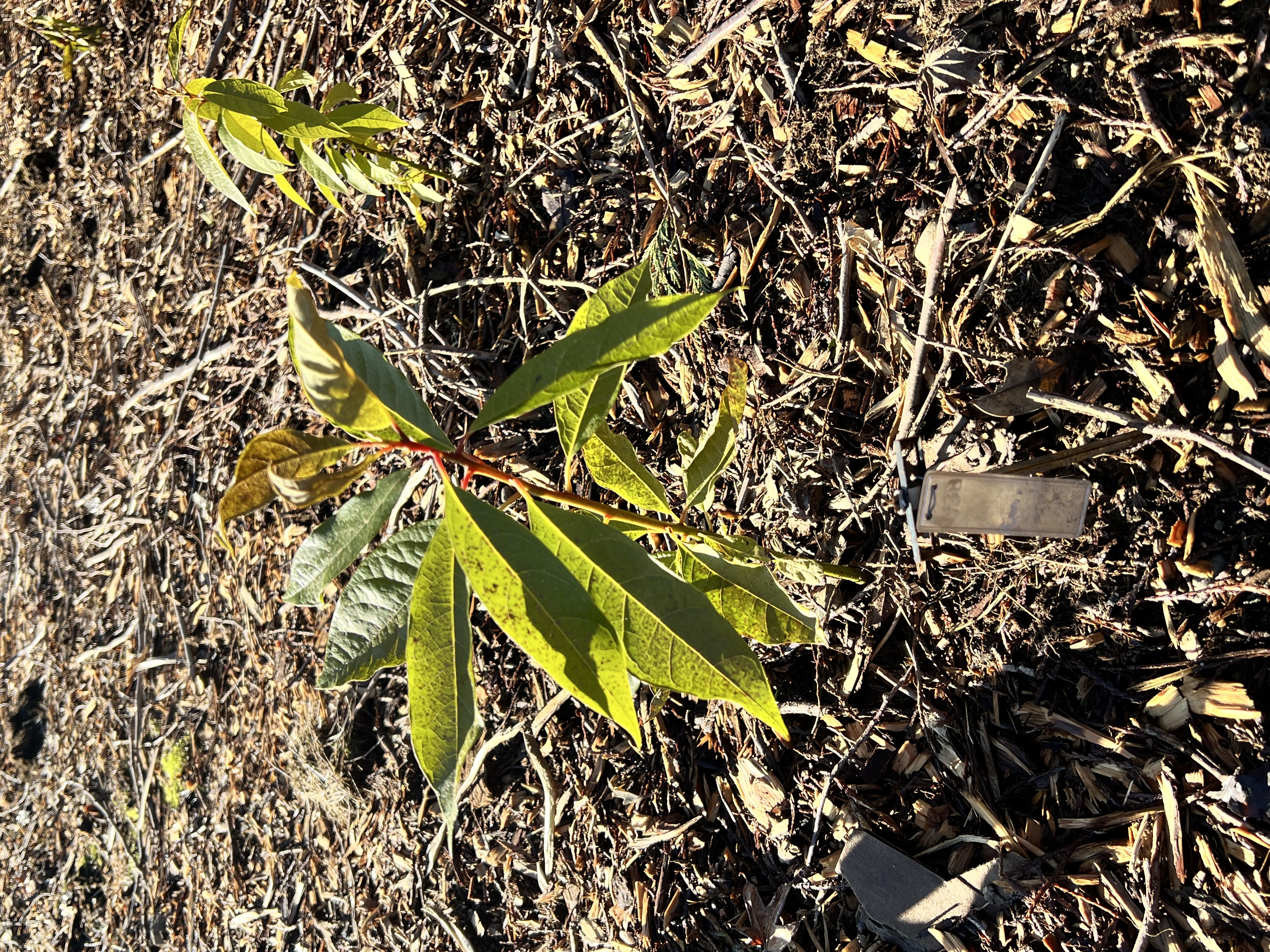 After about a week of overnight below-freezing temperatures, #438 is doing relatively well. Younger leaves do show some browning and the remaining leaves have spots, but no other obvious distress.