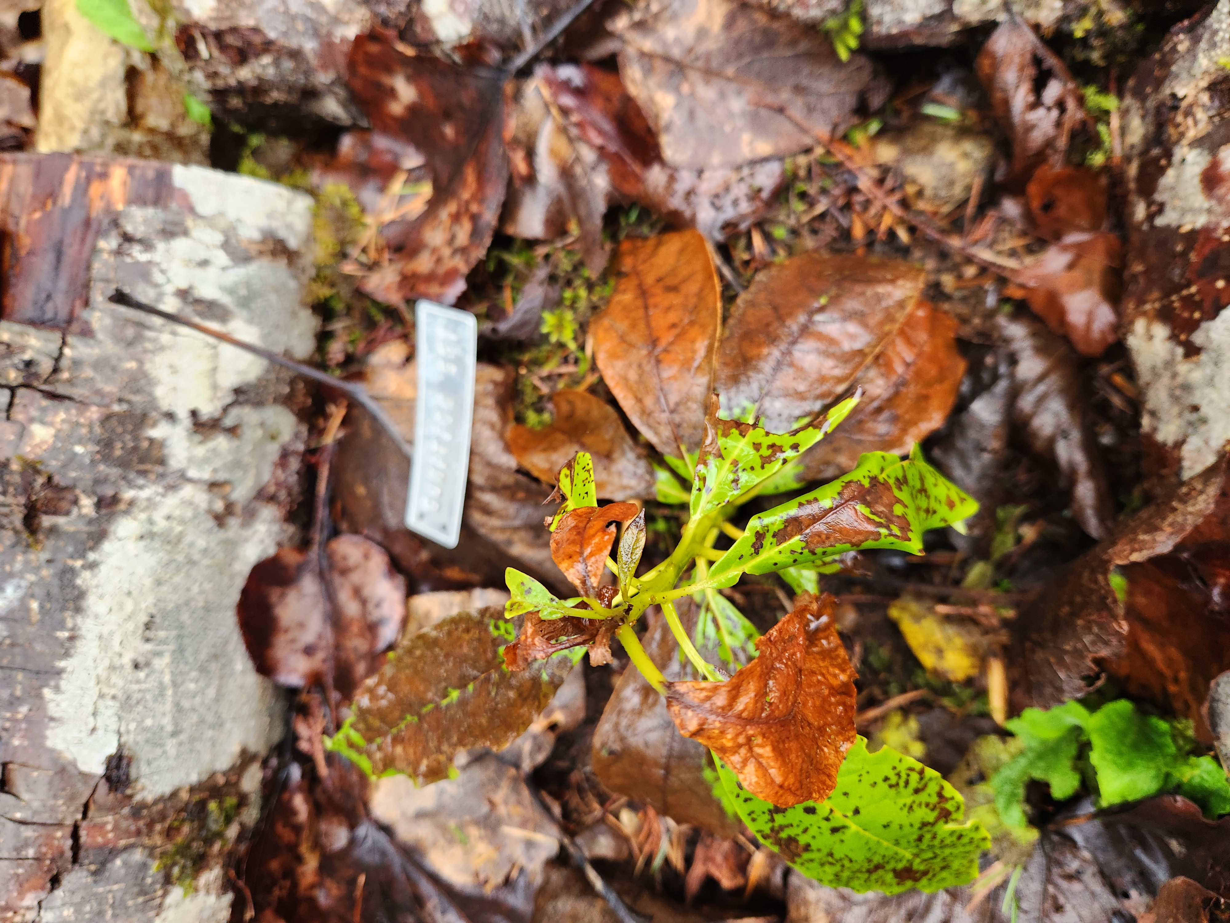Looks like she'll pull through the winter here in Monroe. About a foot tall, with only a thin layer of leaves at the base for protection.