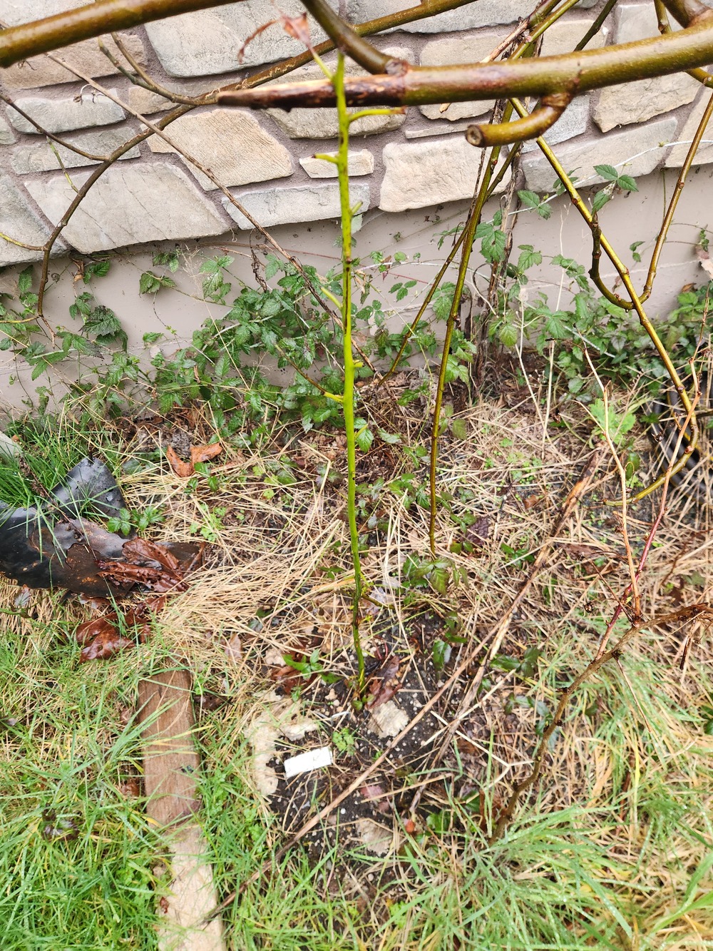 Aargh! Looks like a deer must have snipped off all the leaves, but the trunk looks viable despite only a thin layer of leaves at the base as winter protection, though it is planted next to a south-facing brick wall. It's about 3 feet high.